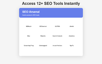 SEO Arsenal의 주요 기능은 SEO 분야에 맞춤화된 북마크 정리기 및 빠른 실행기로서의 역할을 하는 것입니다. 다양한 SEO 리소스에 대한 접근을 통합함으로써 여러 탭이나 북마크를 탐색할 필요를 없애줍니다. 이 기능은 경쟁 분석, 키워드 연구 및 기타 SEO 작업을 위해 이러한 플랫폼에 의존하는 사용자에게 특히 유용하여 시간을 절약하고 생산성을 향상시킬 수 있습니다.